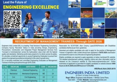 Engineers India Limited (EIL), a Navratna public sector undertaking under the Ministry of Petroleum and Natural Gas, has announced recruitment for Management Trainee (MT) positions through GATE 2026, ...