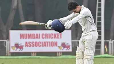 Mumbai’s captain Siddhesh Lad celebrates his century on day two of a Ranji Trophy Elite Group D cricket match between Mumbai and Delhi, at the Sharad Pawar Cricket Academy BKC, in Mumbai, Mahara...